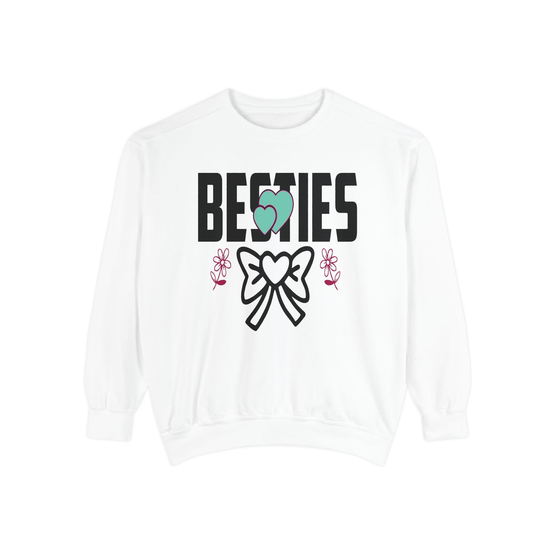 A cozy, garment-dyed sweatshirt that feels lived-in from the first wear. Soft ring-spun cotton with a hint of polyester gives this relaxed-fit pullover a substantial, comforting weight while staying smooth for print and embroidery. The front design — bold block lettering, a mint heart accent and a hand-drawn bow — reads playful and personal, like a shared secret between close friends. Lightweight details like the half-moon neck patch and twill neck tape keep the fit stable and comfortable. Wear it on cooler mornings with jeans or layered over a tee for late-night chats and slow coffee. It’s made with OEKO-TEX low-impact dyes and crafted for adults who want something that looks handcrafted but holds up to everyday life.