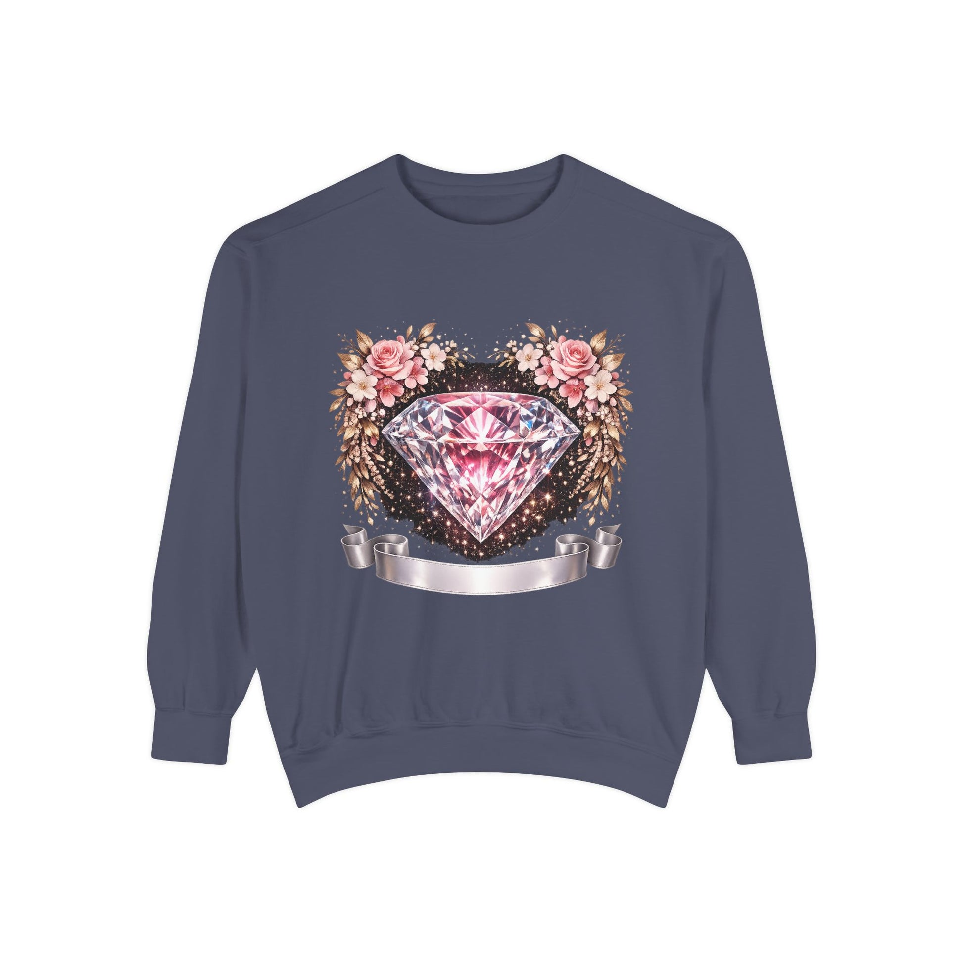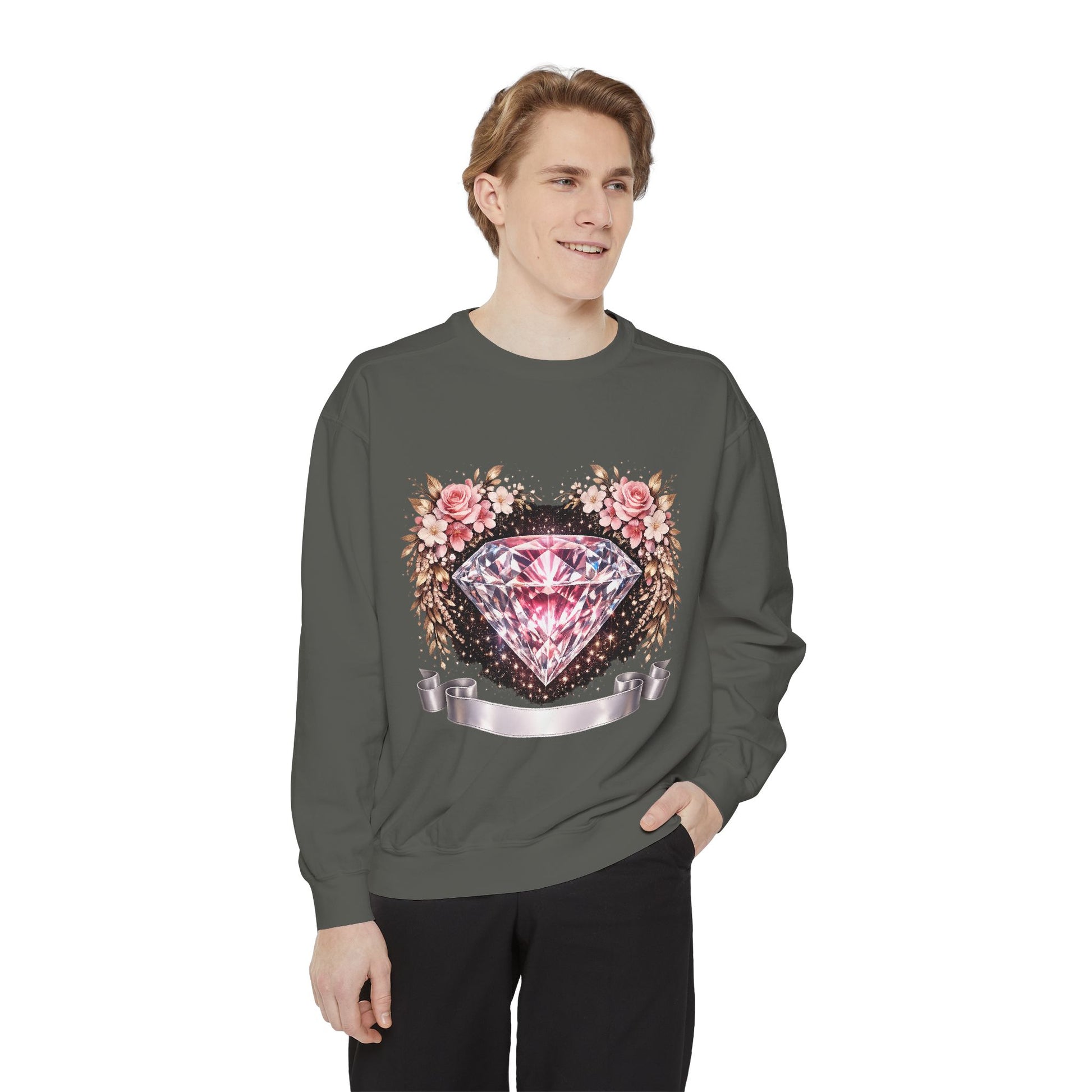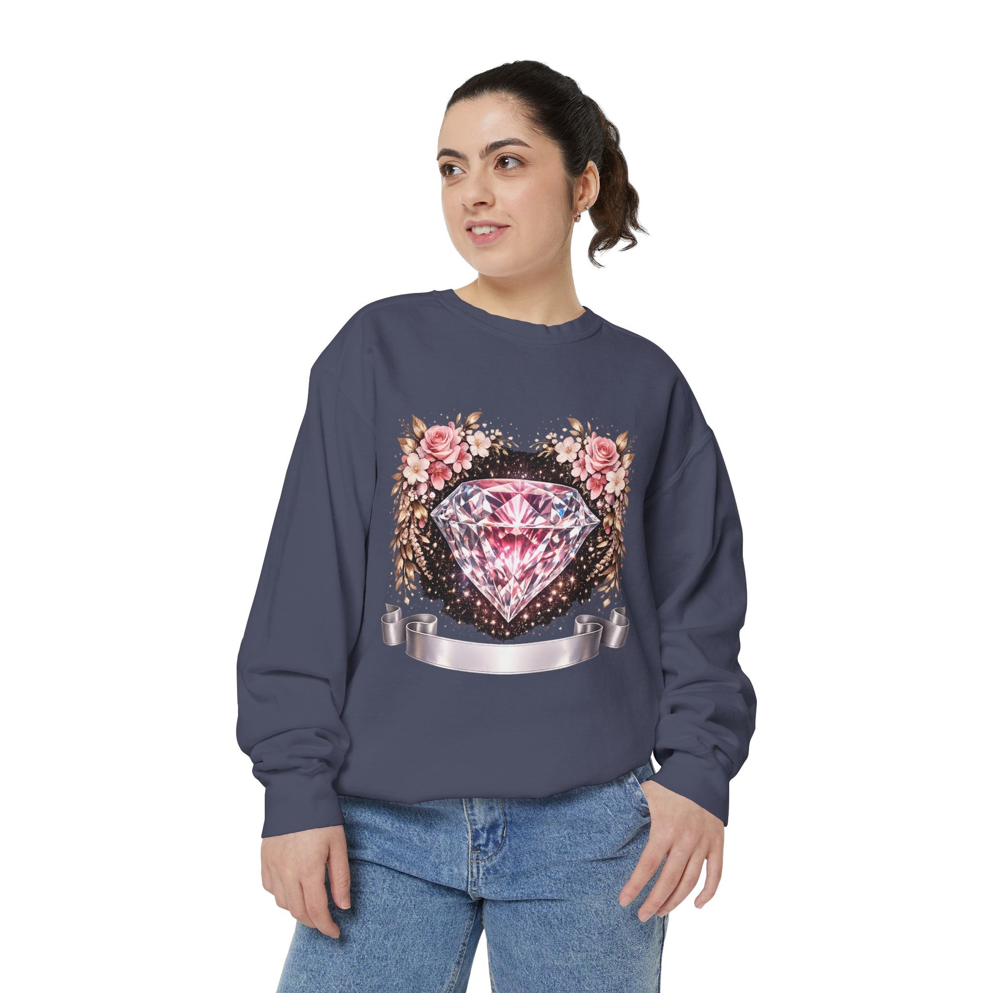 This relaxed-fit sweatshirt blends cozy, lived-in comfort with a feminine, vintage-inspired graphic. A sparkling pink diamond sits at the center of a soft floral wreath, bordered by distressed ink details and a satin ribbon banner — it reads like a treasured find pulled from a closet full of memory and style. Wear it layered over a slip dress for cool mornings, or with jeans on slow afternoons. The medium-heavy ring-spun cotton blend feels substantial but soft, and the ribbed cuffs and hem keep the silhouette grounded without feeling tight. Subtle back neck detailing and the option for small chest embroidery make it feel thoughtfully finished — a quiet, stylish piece that settles into everyday routines and special slow moments alike.