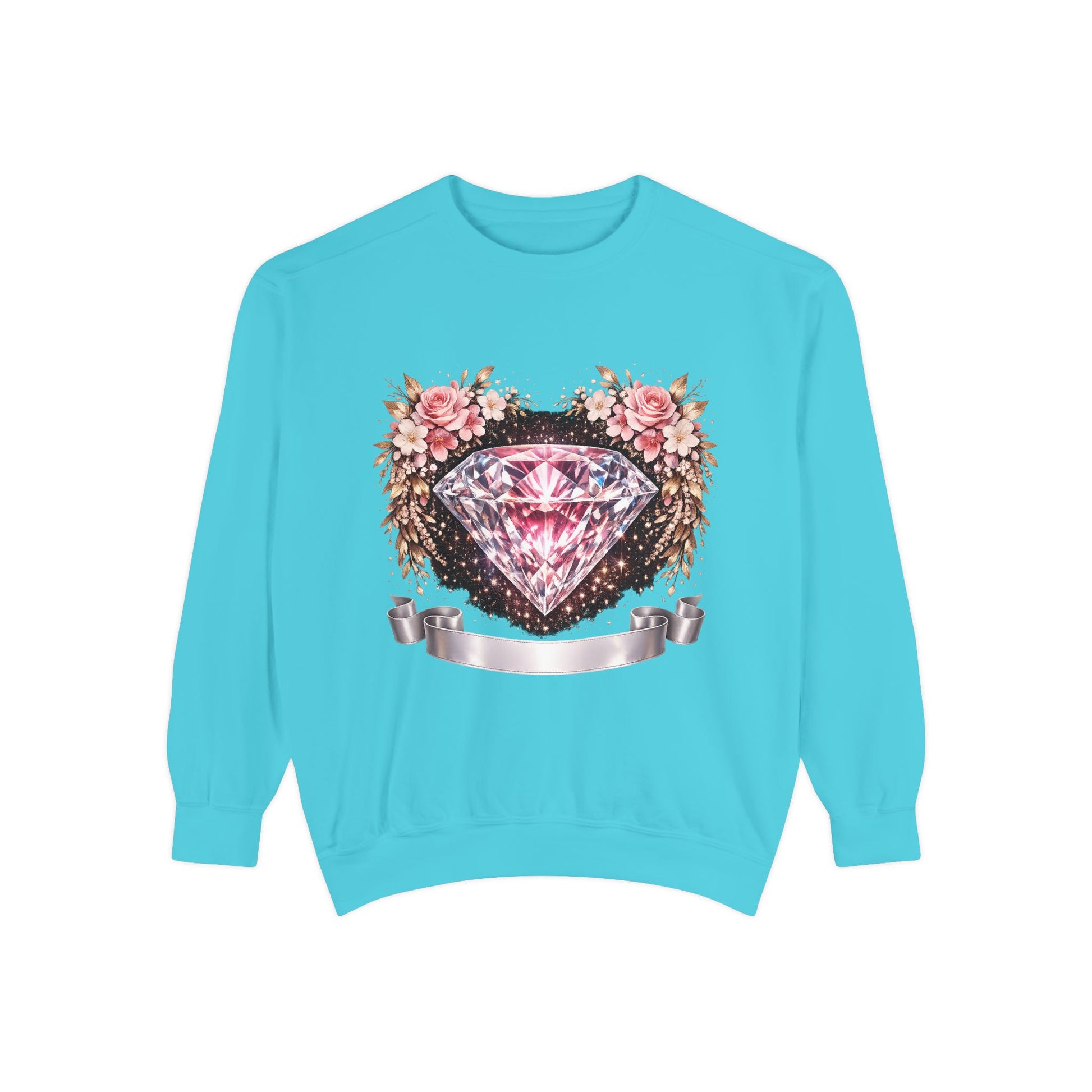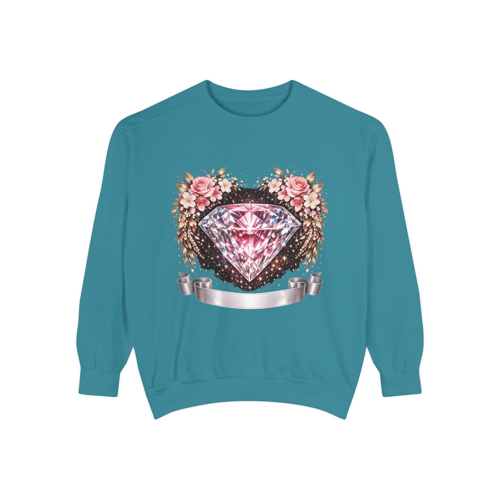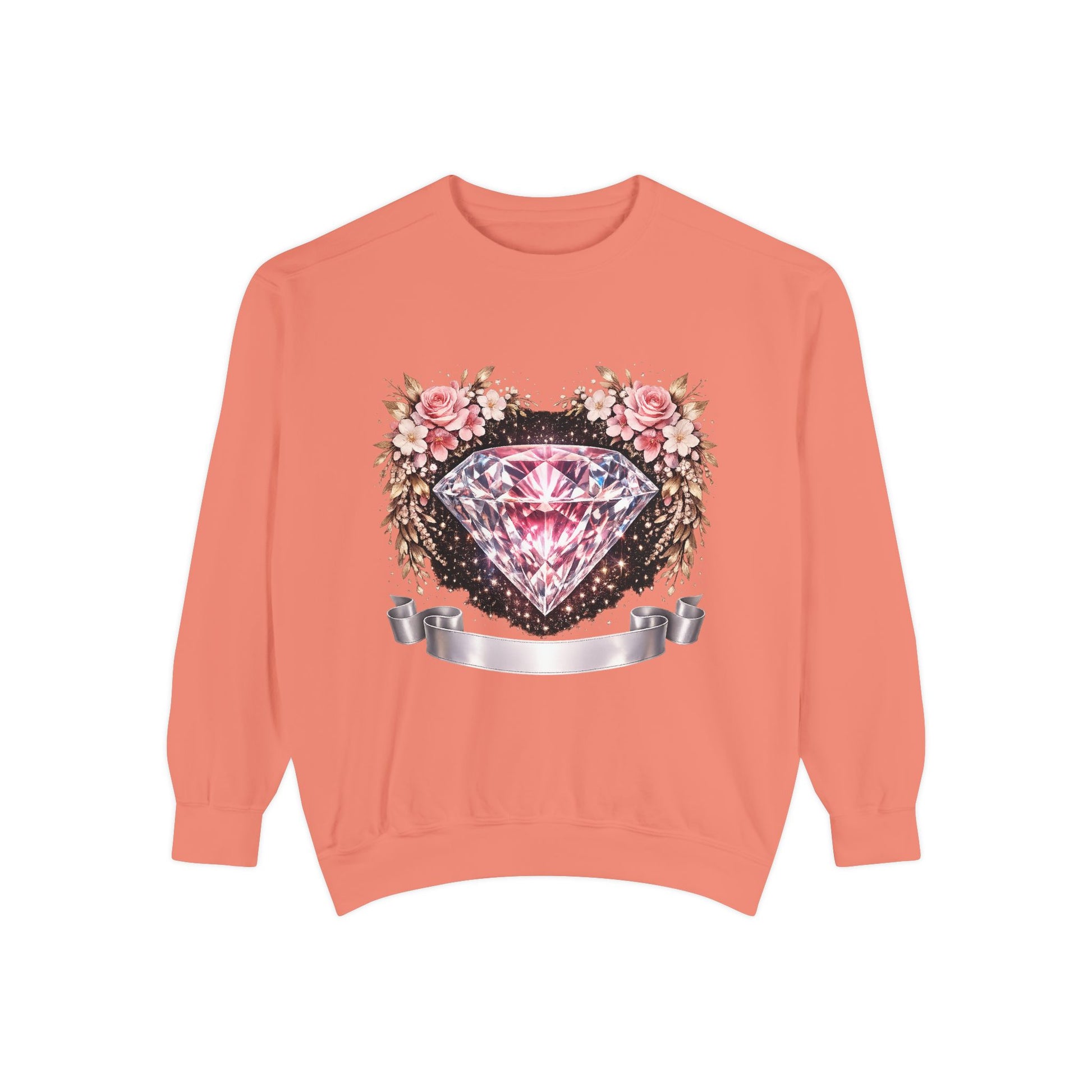This relaxed-fit sweatshirt blends cozy, lived-in comfort with a feminine, vintage-inspired graphic. A sparkling pink diamond sits at the center of a soft floral wreath, bordered by distressed ink details and a satin ribbon banner — it reads like a treasured find pulled from a closet full of memory and style. Wear it layered over a slip dress for cool mornings, or with jeans on slow afternoons. The medium-heavy ring-spun cotton blend feels substantial but soft, and the ribbed cuffs and hem keep the silhouette grounded without feeling tight. Subtle back neck detailing and the option for small chest embroidery make it feel thoughtfully finished — a quiet, stylish piece that settles into everyday routines and special slow moments alike.