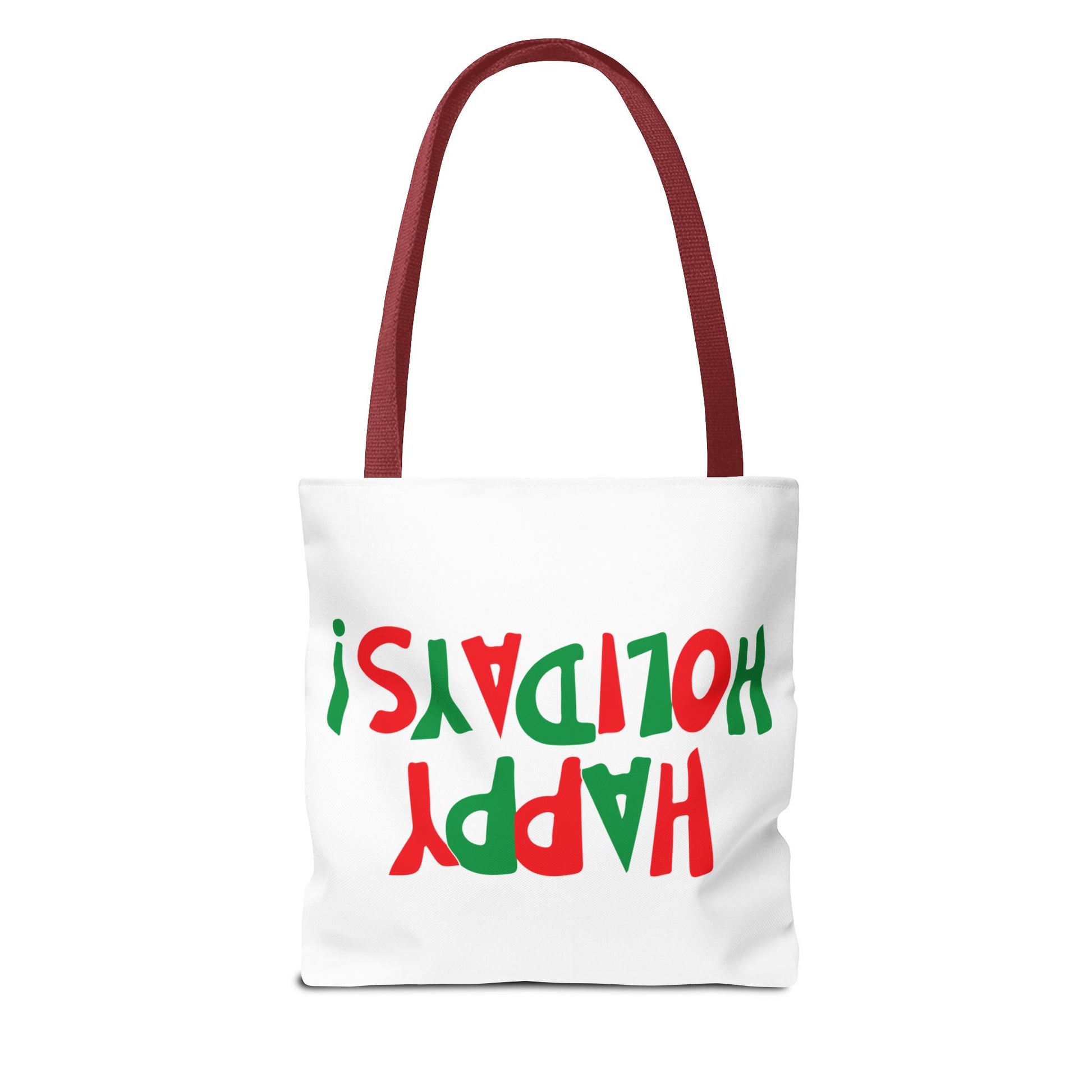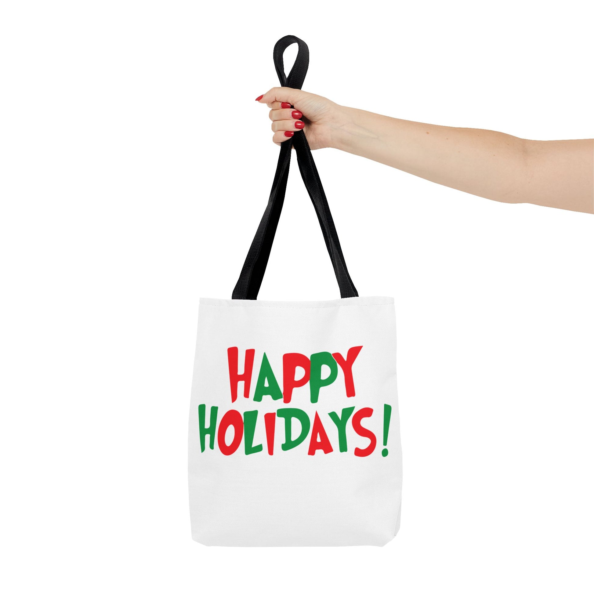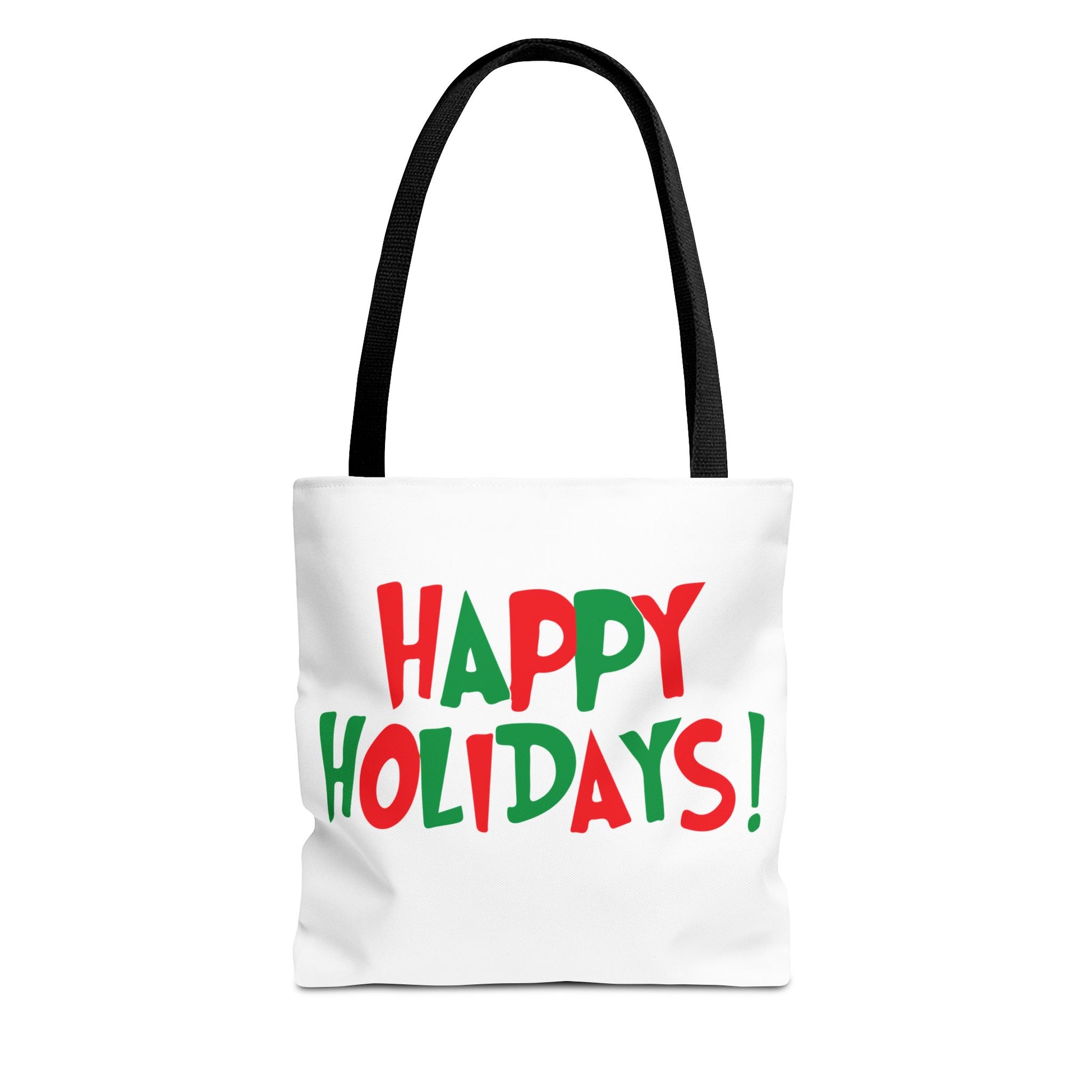 Bright, cheerful tote with a festive “HAPPY HOLIDAYS!” design in playful red and green lettering. Lightweight yet sturdy polyester holds its shape and resists moisture so it travels with you from errands to holiday markets. Boxed corners give extra room for groceries, gift wrap, or cozy winter finds. The black cotton handles and reinforced stitching stand up to daily carrying, while the laminated interior keeps contents protected. This tote brings holiday spirit to everyday life—carry it to caroling nights, seasonal markets, or while wrapping and delivering treats to friends and neighbors.