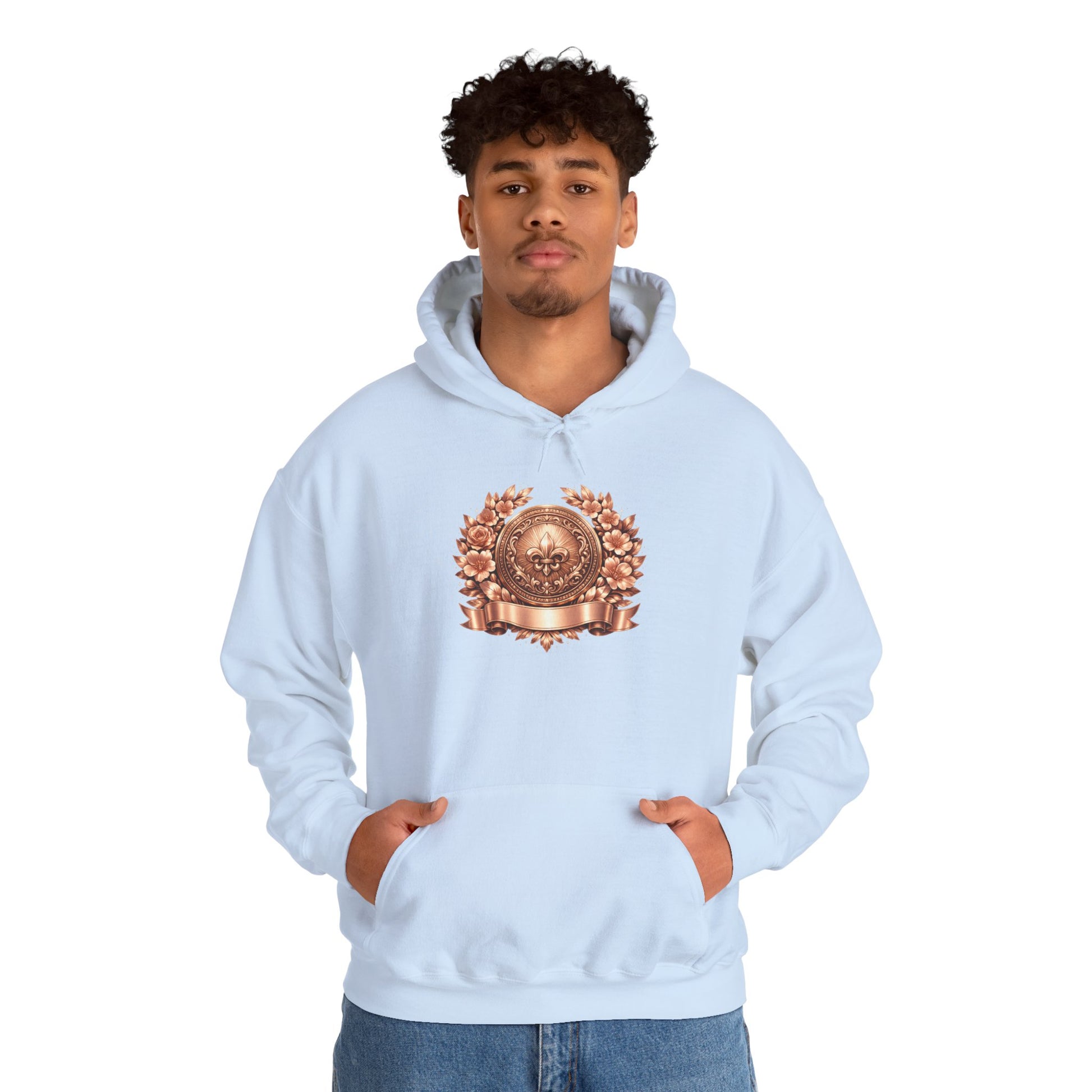 Soft, warm, and quietly striking — this hooded sweatshirt brings a vintage emblem to everyday wear. The muted bronze crest sits centered on a clean white field, framed by delicate laurel details that feel like an heirloom reclaimed for modern life. It’s the kind of layer you pull on for long walks, late-night coffee runs, or slow mornings at home. The roomy kangaroo pocket tucks your hands in, the double-lined hood shields against wind, and the medium-heavy fabric holds shape and color wash after wash. Wear it with faded jeans or layered under a coat; the subtle crest gives an understated, nostalgic edge without shouting for attention.