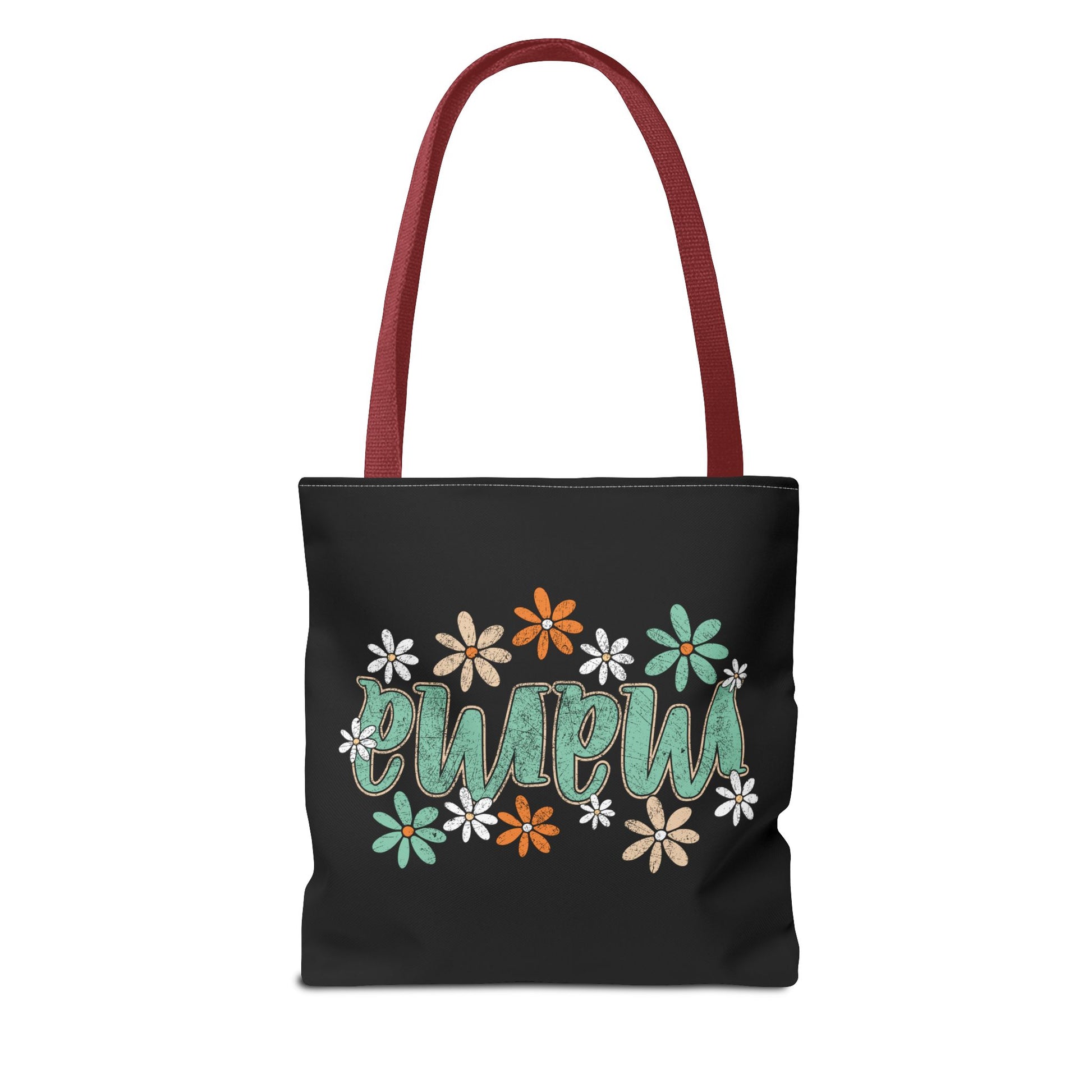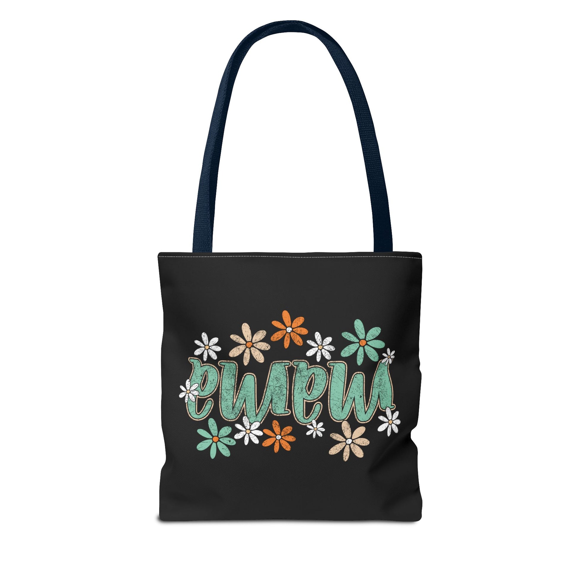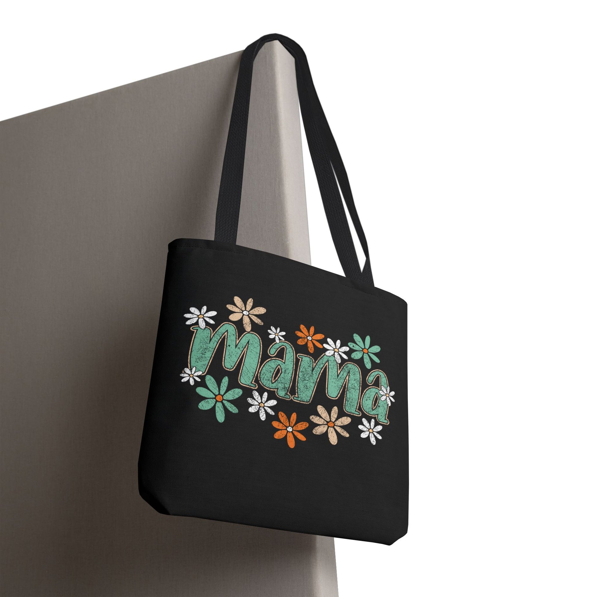 Carry a little sunshine wherever you go. This roomy tote blends a vintage hand-lettered “Mama” with scattered daisy blooms in muted teal, orange, and cream against a rich black background. It feels relaxed and familiar—made to hold groceries, library finds, or the small chaos of daily life while adding a warm, homespun note to your look. Lightweight yet structured, the bag keeps its shape and shows off the design on both sides so the message reads from any angle. Bring it to weekend markets, school drop-offs, or casual coffee runs when you want something cheerful and reliable at arm’s reach.