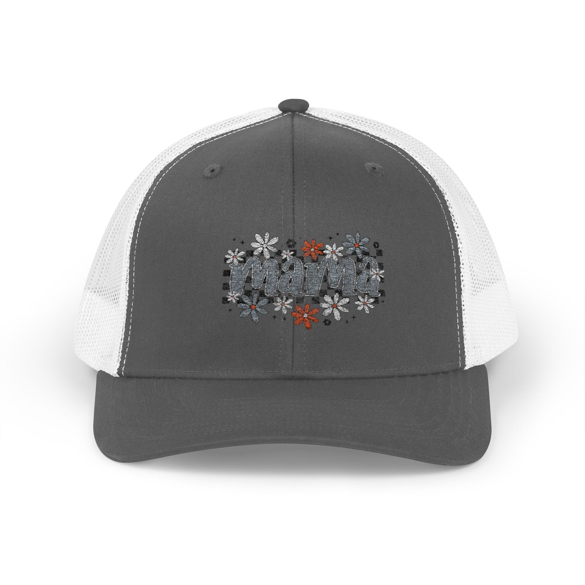 A structured mid-profile trucker cap that blends breathable comfort with subtle, nature-inspired flair. The front panels display a delicate cluster of floral and snowflake-like motifs in muted grays and warm copper accents, giving the hat a quietly artistic feel. The permacurv visor and matching undervisor keep the silhouette classic and clean, while the mesh back and adjustable snap let air flow freely and fit be dialed in. Wear it on cool mornings, trail walks, or when you want a low-key accessory that reads outdoorsy and refined. The cotton sweatband and sturdy buckram front hold shape through repeated wear, and small details like the brand sticker and sewn-in label add authentic, crafted appeal.