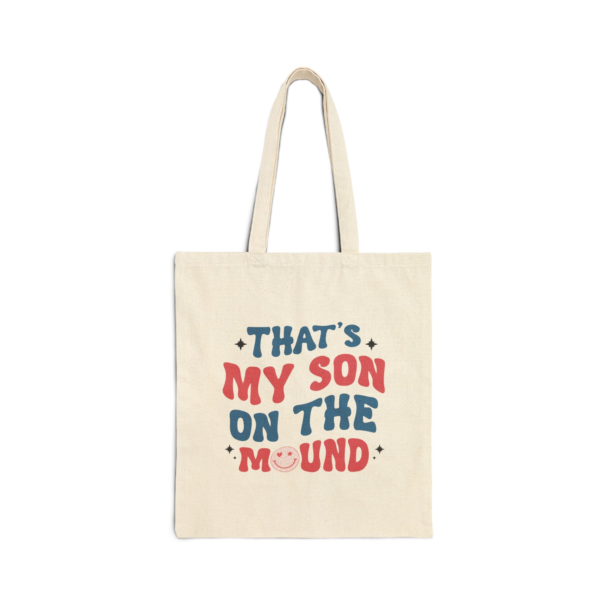 Lightweight but built to last, this cotton canvas tote carries the small, proud moments every parent loves. The design — cheerful hand-lettering that reads “That’s my son on the mound” with a tiny baseball cap accent — sits centered on a sturdy natural canvas that wears in beautifully over time. Long, reinforced self-fabric handles slip over a shoulder or rest in hand. The flat-corner construction keeps the silhouette slim and tidy, so the bag slides easily into a stroller basket or cupboard until it’s time to head out to the field. Bring it to youth games, weekend errands, or stadium days to quietly celebrate the player you root for.